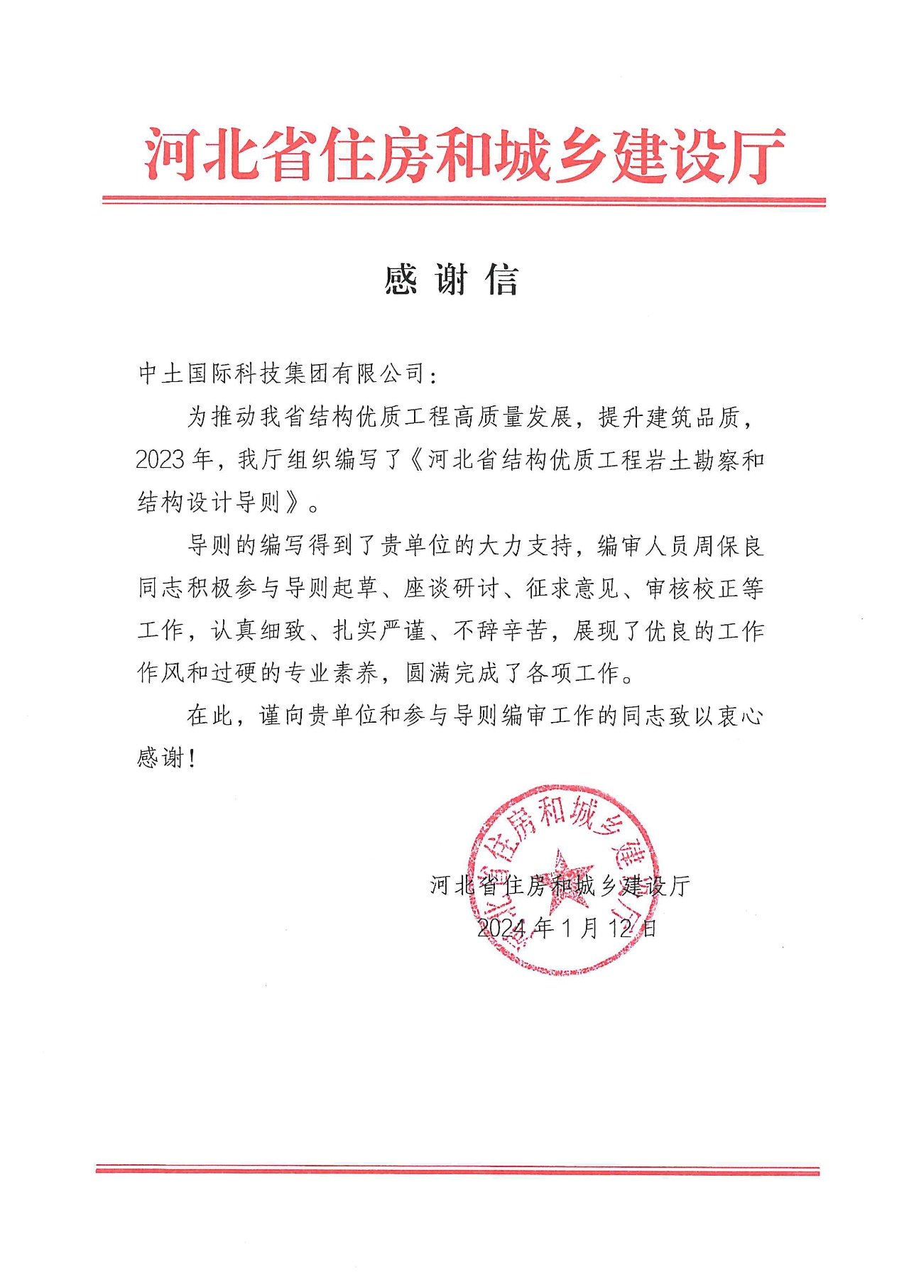 近日,河北省住房和城鄉建設廳給集團發來感謝信,對集團的大力支持以及參與《河北省結構優質工程巖土勘察和結構設計導則》編寫的周保良等同志表示真摯的感謝。